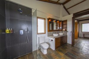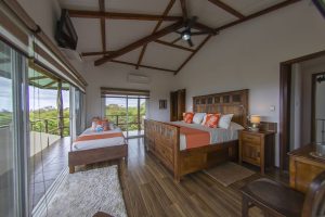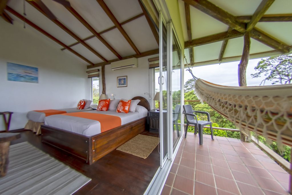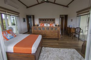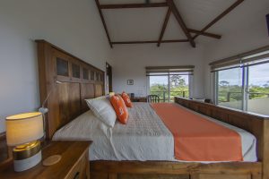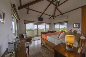 A rustic wooden staircase leads to this extra spacious south-facing bedroom with a queen-size bed, wooden flooring, wall-to-wall sliding glass doors to the south, private balcony, en-suite shower room and walk-through wardrobe. Windows offer views to the north, south, east and west.