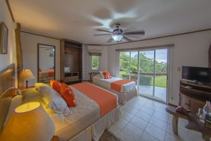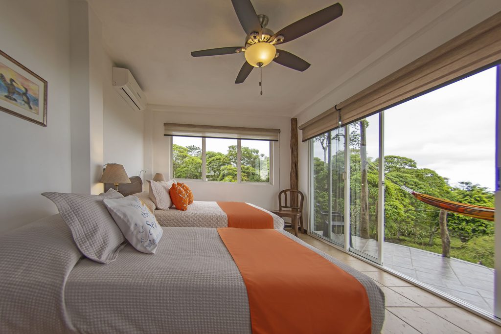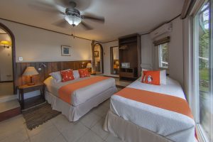 Two large south-facing rooms and one garden facing room have access to a private terrace via wall-to-wall sliding glass doors, one queen bed and one twin bed en-suite shower rooms (main image above shows Superior Room 6, an exception, with cuadruple bed arrangement, large shower room and walk through wardrobe. Ideal for families of four).